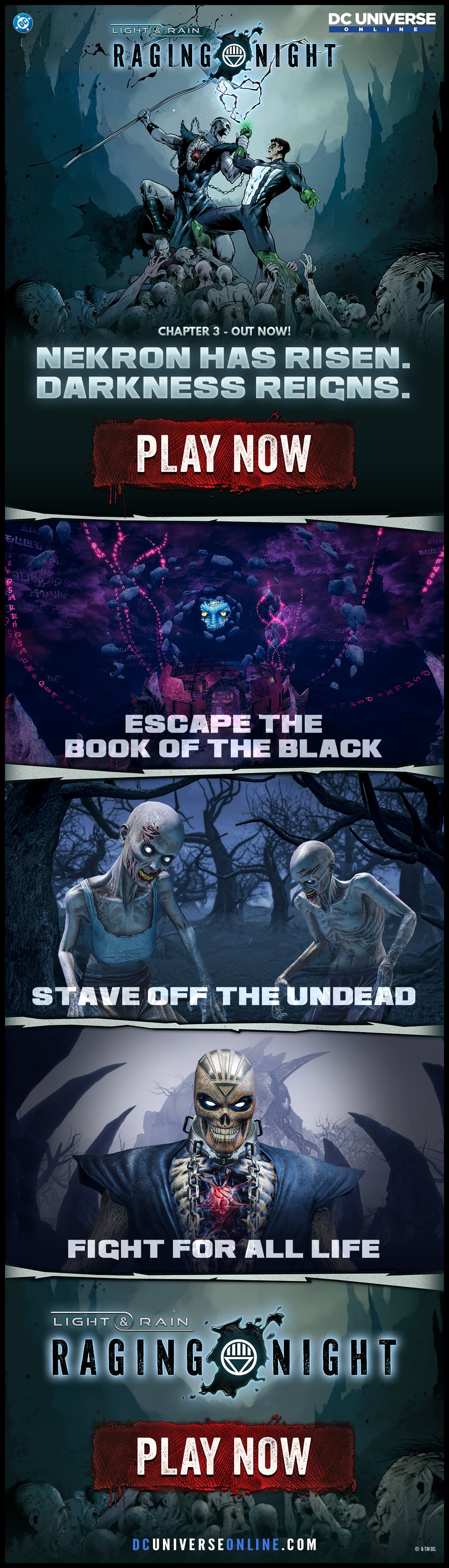 The battle against fear takes a darker turn in Chapter Three of Light and Rain: Raging Night. Plunging players into the heart of despair as sorrow, death, and corruption threaten to consume the living planet Mogo. Lyssa Drak has unleashed Nekron and the Black Lanterns, using Luzia Cavalera’s transformation into a Gray Lantern to spread sorrow energy that drains and weakens Lanterns. With sorrow spreading unchecked, you must stand alongside Kyle Rayner to save as many as possible before it’s too late.