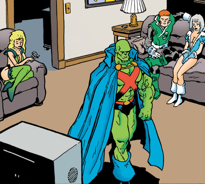 Before the argument could continue, the form of J’onn J’onzz, the Martian Manhunter, phased through a nearby wall into the monitor room where the game was taking place.