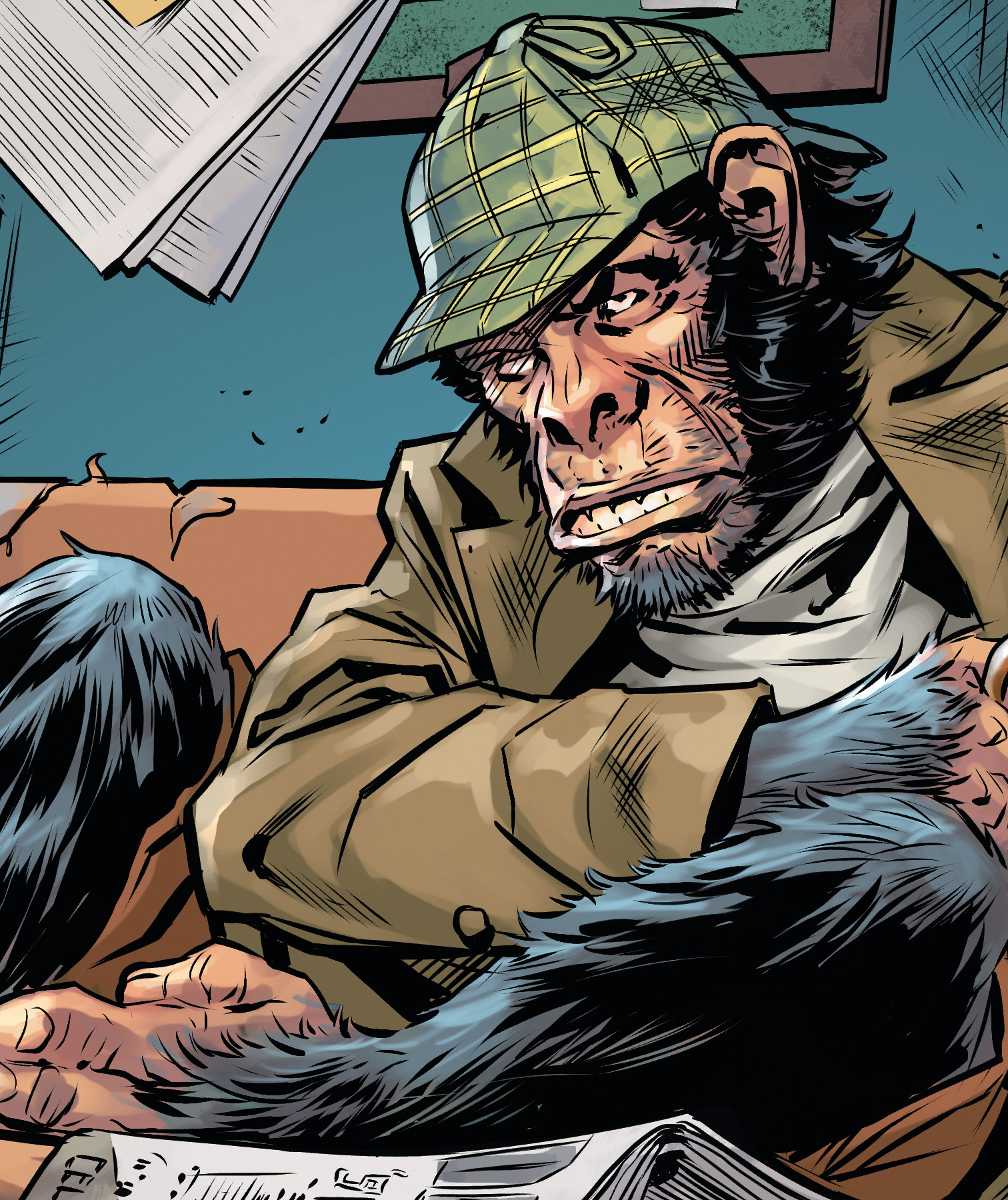 “Alright, Bobo,” Constantine asked his cohort. “What’s the latest in the weird world of Detective Chimp?” The simian sitting across from him grunted, and then wrinkled his nose for a moment.